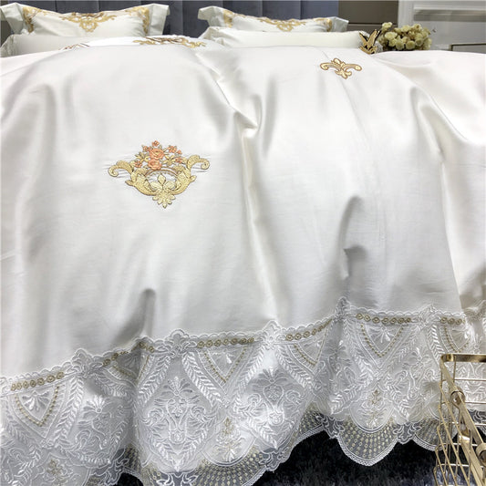 Ensemble de literie de chambre à coucher en coton à longues fibres en satin blanc 60 de style européen, ensemble de quatre pièces en pur coton brodé en dentelle